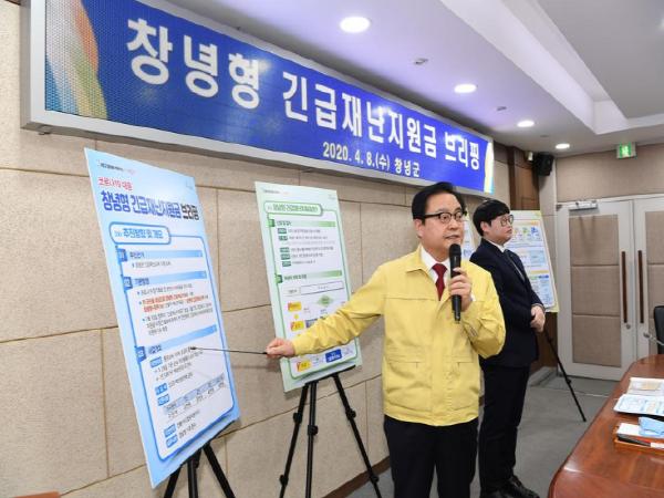 창녕군(군수 한정우)는 8일, 군청 전자회의실에서 브리핑을 통해 정부와 경남의 긴급재난지원금에서 제외되는 군민 15,149가구에게 4월중으로 창녕형 긴급재난지원금을 지급한다고 밝혔다.