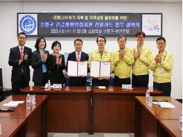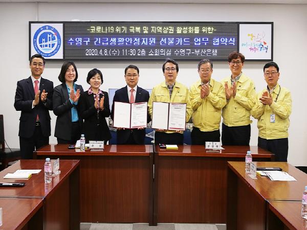 부산 수영구(구청장 강성태)와 부산은행(은행장 빈대인)은 코로나19로 위기에 처한 가계소득을 지원하고 침체된 지역경제를 활성화시키기 위한 비상경제체제의 일환으로 추진중인 긴급생활안정자금 지원 선불카드(일명 수영구 코로나19극복카드) 제작과 관련하여 상호간 업무협약을 강성태 수영구청장과 손강 부산은행 부행장이 참석한 가운데 4월 8일(수) 11:30 수영구에서 체결하였다고 밝혔다.