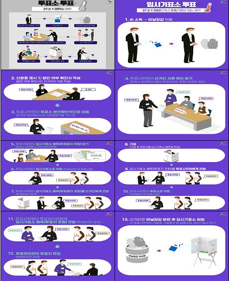 이 때 체온이 37.5도 이상이거나 호흡기 증상이 있는 사람은 다른 선거인과 동선이 겹치지 않도록 별도 설치된 임시기표소에서 투표하게 하고, 선거인이 사용한 임시기표소는 즉시 소독하고 환기할 예정이다.