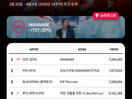 있지의 ‘워너비(WANNABE)’ 뮤직비디오는 케이팝 레이더 2020년 14주 차 집계 기간(3월 29일~4월 4일) 동안 794만 뷰를 기록하며 주간 차트 1위에 올랐다.