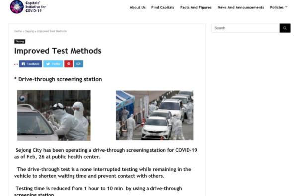 세종시는 이를 통해 ▲자가격리 ▲사회적 거리두기 ▲마스크 현황 관리 사이트(세종엔) ▲승차용·도보용(Drive·Walking-through) 검사 ▲해외 입국자 특별 관리 등을 소개했다.