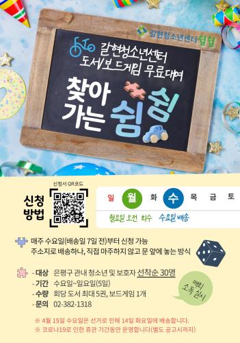 이에 은평구 갈현청소년센터에서는 4월부터 지역사회 청소년이 가정에서 가족과 함께 즐길 수 있는 놀이와 더불어 건강한 여가를 통한 삶의 활력을 더할 수 있도록 센터 내 문화공간의 도서와 보드게임을 무료로 대여해주는 ‘찾아가는 쉼쉼[따르릉]’프로그램을 운영하고 있다.