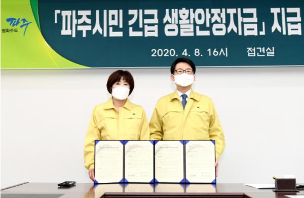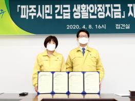 파주시는 지난 8일 NH농협은행 파주시지부와 ‘파주시민 긴급 생활안정자금’의 신속하고 편리한 지급과 안전한 관리를 위한 업무협약을 체결했다고 밝혔다.