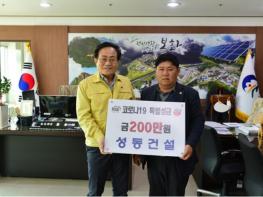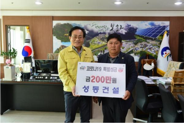 봉화군 가스협회(회장 전태구)와 내성상우회(회장 김산옥)에서 4월 7일 봉화군청을 방문하여 코로나19 극복을 위해 각각 특별성금 100만원을 기탁했다.
