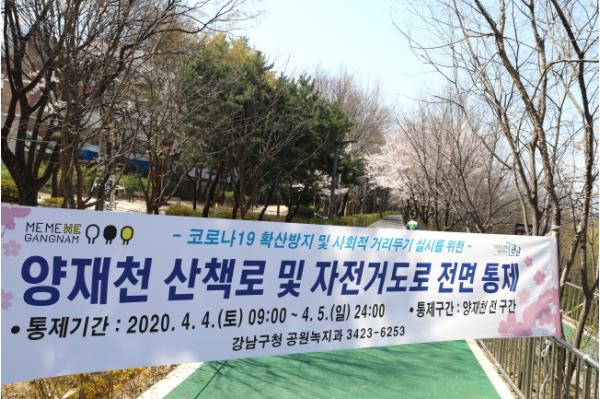 아울러 다음주 월요일인 13일부터 사회적거리 두기 캠페인 종료시점까지 양재천 산책로 강남구 4.25km(탄천2교~영동2교)구간과 서초구 0.45km(영동2교~수변무대)구간, 서초구 여의천 0.36km(여의1교~여의교)구간은 계속해서 일방통행을 실시하여 양방향 통행으로 이용객들끼리 얼굴을 마주쳐 코로나19 감염이 발생할 소지를 차단하기로 했다.