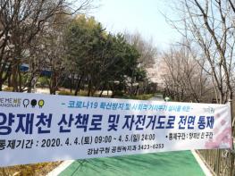 조은희 서초구청장과 정순균 강남구청장은 9일 오전 협의를 통해 11일(토) 오전 9시부터 12일(일) 자정까지 서초구·강남구 관내 8.55km 양재천 전구간을 폐쇄하기로 결정했다.