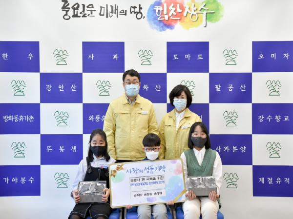 9일 장수읍에 거주하는 할머니 김정숙(63)씨와 손주 손주연(14)·손진경(12)·손경태(9) 형제들이 군청을 찾아 마스크 130장(130만원 상당)과 손소독제 30개를 장수군에 기탁했다.