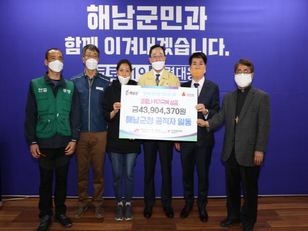 해남군(군수 명현관) 공직자들이 코로나19 여파로 어려움을 겪고 있는 군민들의 고통을 분담하고 지역공동체 취약계층을 지원하기 위해 성금을 모금, 4,390만 4,000원을 기탁했다.