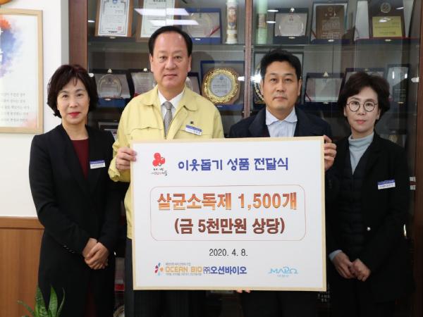 예방의학을 전문적으로 연구하는 바이오벤처기업 ㈜오션바이오(대표이사 임채수)는 지난 8일 5000만원 상당의 뿌리는 살균소독제 1500개를 마포구에 기부했다.