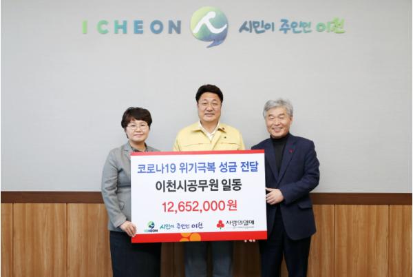 이천시 공무원들은 코로나19 확산으로 어려움을 겪는 국민들과 헌신봉사하는 의료인들을 돕기 위해 4월 3일부터 9일까지 자발적 성금 활동을 진행해서 총 12,652,000원의 성금을 모았다.