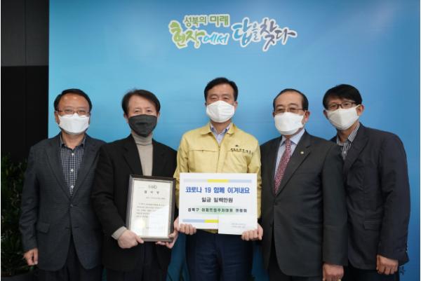 성북구 아파트입주자대표 연합회(이하 성·아·연, 회장 손성호)는 코로나19로 생계를 위협받고 있는 자영업자나 어려운 가구의 지원을 위해 성금 100만원을 성북구에 기부했다고 한다.