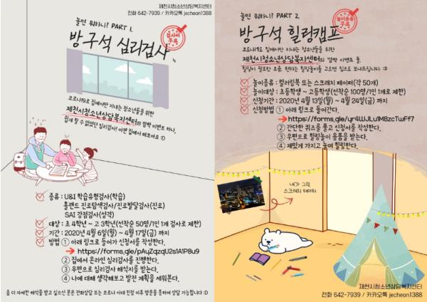 제천시청소년상담복지센터(센터장 이경희)는 코로나19 극복을 응원하고 청소년들의 불안감 해소 및 마음의 안정화를 지원하기 위하여 지역 내 청소년을 대상으로 ‘놀면뭐하니?’ 프로그램을 운영한다.