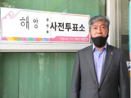 송 의장은 투표에 앞서 발열 체크를 하고 비치된 세정제로 손 소독을 한 뒤 일회용 비닐장갑을 착용 후 투표를 마쳤다.