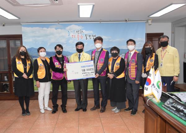 국제라이온스클럽 제354-H지구 제1지역(동두천, 무궁화, 목련)은 지난 9일 동두천시청을 방문하여, 코로나19 피해 극복을 위한 성금을 윤문희 지역부총재는 200만원, 동두천·무궁화·목련 라이온스 클럽은 100만원을 합동으로 기부하였다.