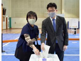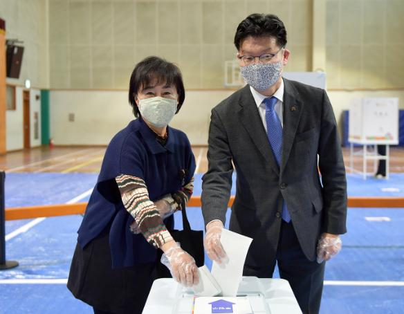 이날 김 시장은 오전 8시 부인 곽현실 씨와 사전투표장을 찾아 투표를 실시하고 투표 종사자들을 격려했다.