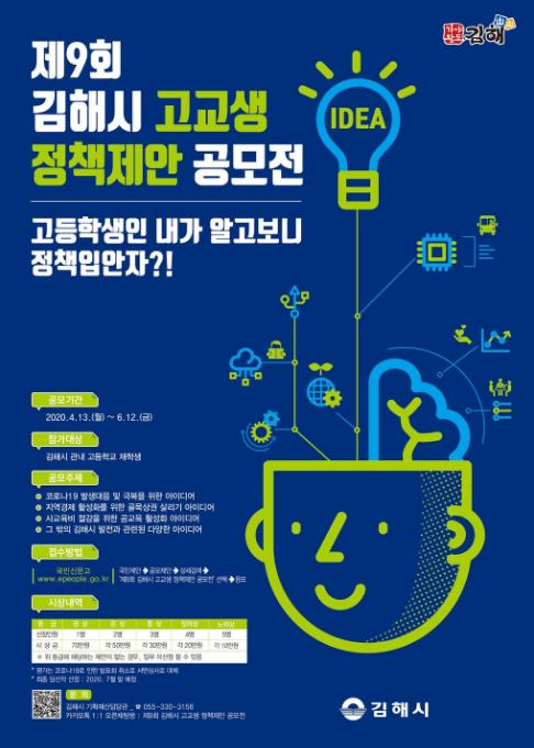 허성곤 김해시장은 “이번 공모전이 학생들의 생기발랄한 아이디어를 마음껏 뽐낼 수 있는 장이 되길 바라며, 고교생들의 눈높이에 맞는 창의적이고 우수한 제안을 시정에 반영하여 ‘김해를 더 김해답게’ 만들도록 노력하겠다”고 말했다.