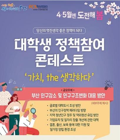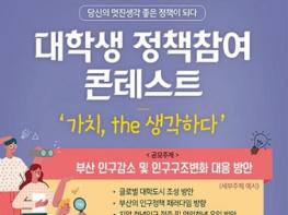 부산시(시장 오거돈)와 부산대학교(총장 전호환)는 지역 현안에 대한 인식 공유 및 시민 체감형 정책 발굴을 위한「대학생 정책참여 콘테스트 ‘가치, the 생각하다’」를 개최한다고 밝혔다.