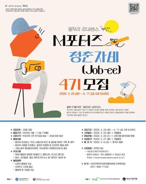 부산시(시장 오거돈)는 시와 정부의 각종 일자리 정책과 사업을 시민들에게 효과적으로 홍보하고 체감할 수 있도록 운영하는 ‘청춘자비(Job-ee) 서포터즈’ 제4기(30명)를 4월 17일까지 모집한다고 밝혔다.