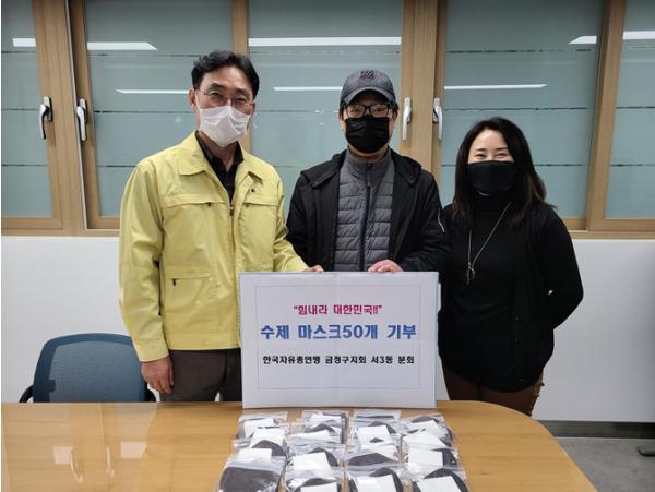한국자유총연맹 금정구지회 서3동 분회(회장 이학봉)는 지난 27일 금정구(구청장 정미영) 서3동 행정복지센터에 코로나19 예방을 위한 수제 마스크 50매와 필터 50매를 기부했다. 이학봉 회장이 직접 본을 떠 박음질하고, 세탁·다림질·살균 등 마스크 한 장 한 장에 정성을 담았다.