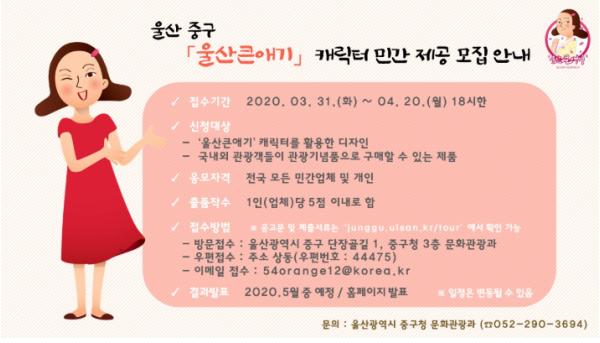 중구는 ‘울산큰애기’ 캐릭터를 민간에 추가로 제공하기로 결정하고, 오는 4월 20일까지 캐릭터 사용과 캐릭터 상품 제작을 희망하는 업체를 모집한다고 31일 밝혔다.