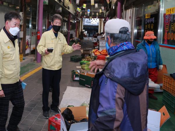 12일 코로나19 감염예방을 위해 오전 6시부터 군청 일자리경제과와 읍사무소 직원 15명이 울진읍 공설시장으로 진입하는 노점상들의 신분증을 확인하는 등 외부 노점상 차단에 총력을 기울여 코로나19 감염병 차단에 최선을 다했다.