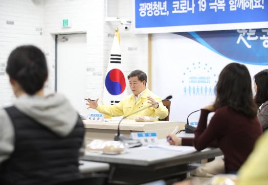 박승원 광명시장은 “오늘 간담회는 코로나19로 취업·창업 일선에서 청년들이 겪고 있는 어려움을 직접 듣고 이를 돕기 위한 시의 역할을 구체화하기 위해 마련했다”며 “코로나19 확진자 중에 20~30대가 38%로 높은 비중을 차지하고 있다. 본인으로 인해 가족들이 감염되지 않도록 활동이 많은 청년이 사회적 거리두기, 마스크 착용, 손 씻기를 철저히 지켜달라”고 당부했다.