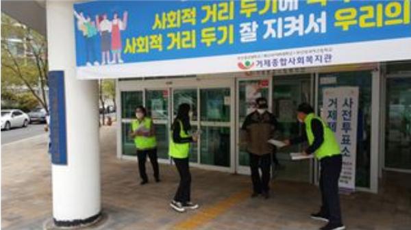 연제구 거제2동(동장 한수철)은 지난 10일 사전투표가 진행된 첫 날 사전투표소와 거성시장 등 주민 밀집 지역에 지역사회보장협의체(위원장 손영혜)와 민관협력으로 코로나19 확산방지 행동요령 거리 캠페인을 실시했다.