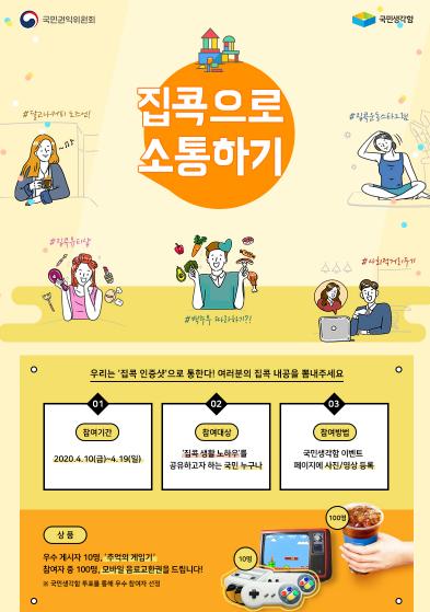 국민권익위원회(위원장 박은정)는 국민들이 서로 격려하고 응원하며 ‘사회적 거리두기’에 동참할 수 있도록 ‘집콕으로 소통하기’를 주제로 온라인 소통창구인 국민생각함’(idea.epoeple.go.kr)에서 이번 달 10일부터 19일까지 이벤트를 진행한다.