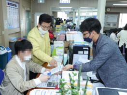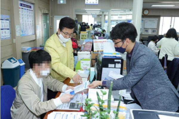 긴급재난지원금 지급을 마친 허태정 시장은, 코로나19로 인한 시설점검, 방역, 선거, 긴급재난지원금 지급 등 지난 2월부터 쉼 없이 일해 온 태평1동 김낙례 동장과 직원들을 격려했다.