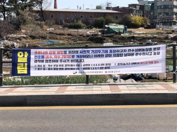 특히, 구는 코로나19 확산 예방과 고강도 사회적 거리두기 실천을 위해 홀?짝수일제를 운영하고, 경작자들의 마스크 필수착용 등 코로나19 확산 방지를 위한 행동지침도 철저히 준수되도록 할 계획이다.
