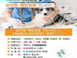 제주시는 반려동물의 광견병 예방과 시민의 안전을 위해 4월 1일부터 5월 15일까지 3개월령 이상의 반려동물(개,고양이)에 대한 광견병 예방접종을 지원한다고 밝혔다.