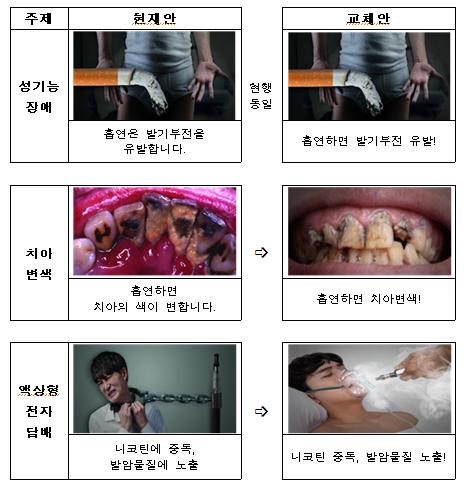 (경고그림) 3종(후두암, 성기능장애, 궐련형 전자담배) 그림의 경우, 현행 그림이 효과성 점수가 매우 높거나, 질환에 대한 직관적 이해도가 높은 점을 고려하여 현행 그림을 유지하였다.