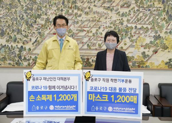 종로구(구청장 김영종)는 코로나19 위기 극복을 위해 전 직원이 참여하는 「종로구 착한 운동」 을 추진하고, 지난 9일(목) 사단법인 한국이주여성인권센터에 마스크 1,200매와 손소독제 1,200개를 전달했다.