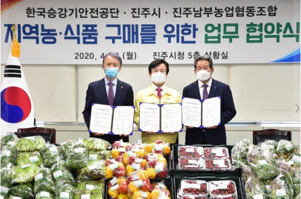 이날 협약식에는 조규일 진주시장, 김영기 한국승강기안전공단 이사장, 송정효 진주남부농업협동조합장을 비롯한 각 기관 관계자들이 참석해 상호 협력 협약서에 서명하고, 지역 농·식품 구매 확대를 위한 협력방안 및 코로나19 극복을 위한 지역 상생방안에 대한 의견을 나눴다.
