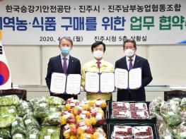 진주시와 한국승강기안전공단, 진주남부농업협동조합은 13일 오후 4시 진주시청 5층 상황실에서 지역 농·식품 구매 확대를 위한 먹거리 업무협약을 체결했다.