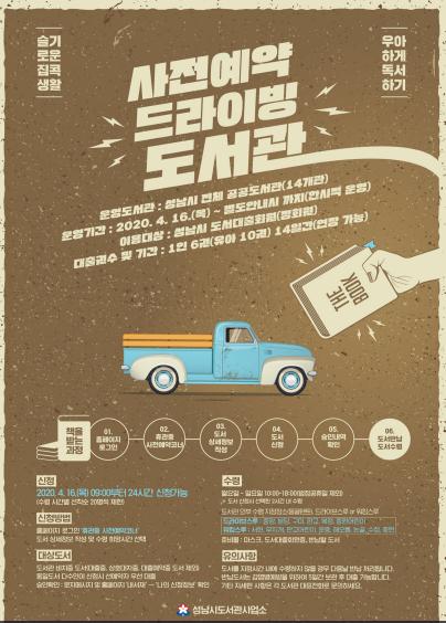 성남시는 코로나19 확산 방지를 위해 14곳 모든 공공도서관에 오는 4월 16일부터 드라이브 스루(Drive thru) 또는 워킹 스루(Walking thru) 방식의 도서 대출 서비스를 도입한다.
