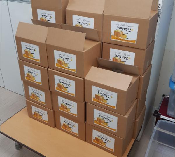 ‘희망백신’이라는 이름으로 만들어진 구호물품세트는 코로나19 예방을 위한 마스크, 손소독제, 손소독 물티슈 등으로 구성되어 있으며, 지난 9일 사회복지사들이 응원메시지와 예방용품이 담긴 박스를 직접 가정으로 배달하였다.