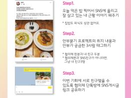 이번 캠페인에 참여하고 싶은 청년은 SNS에 자신의 한 끼 밥상 인증 사진과 함께 근황을 적고, 안부가 궁금한 친구 세 명을 태그하여 릴레이 캠페인 참여를 권유하면 된다.