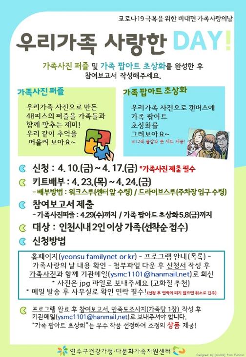 연수구건강가정.다문화가족지원센터(센터장 주영신)가 ‘코로나19’를 이겨내기위한 사회적 거리두기로 위축된 시민들을 위해 가족사랑의 날 비대면 프로그램 ‘우리가족 사랑한 DAY’를 진행한다.