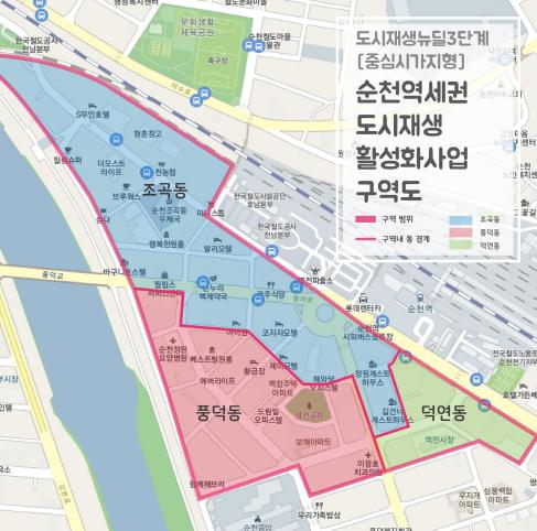 순천역세권 도시재생 활성화사업은 조곡ㆍ풍덕ㆍ덕연동 일원을 대상으로 지난 2019년 국토부 공모사업에 선정(도시재생뉴딜 3단계 중심시가지형)되었으며 ‘생태비즈니스 플랫폼 순천역전’이라는 비전과 주민의 참여와 주도로 2023년까지 마중물사업을 추진하고 있다.