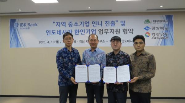 경상남도 자카르타사무소가 대구?경북 자카르타사무소와 함께 코로나19로 수출 및 운영에 어려움을 겪고 있는 지역 중소기업을 지원하고자 13일 기업은행 인도네시아법인과 ‘지역 중소기업 인도네시아 진출 및 인도네시아 한인기업 지원 업무 협약’을 체결했다.