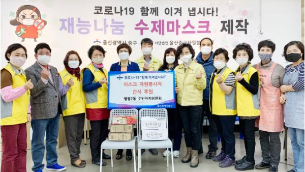 울산 중구 병영2동 주민자치위원회(위원장 심정희)는 13일 오전 10시 30분 전통시장 고객지원센터를 방문해 전달식을 갖고, 마스크를 제작하고 있는 자원봉사자들에게 간식을 제공했다.