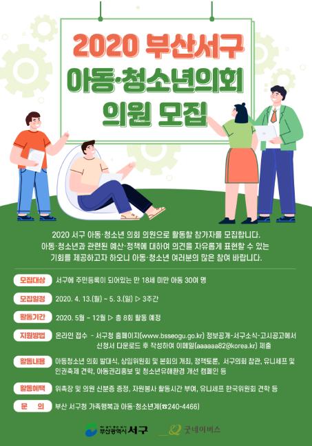 부산 서구(구청장 공한수)가 아동의 권리를 보장하고 선도적인 아동친화도시 조성을 위해 ‘2020년 아동ㆍ청소년의회 의원’을 공개모집한다.