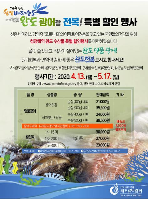 지난 3월말부터 세 차례 진행된 광어·전복 ‘드라이브 스루’ 판매에 이어 4월 13일부터 5월 17일까지 한 달여 동안 ‘힘내라! 광복(광어&전복)’이라는 주제로 광어회와 활 전복을 저렴한 가격으로 판매한다.