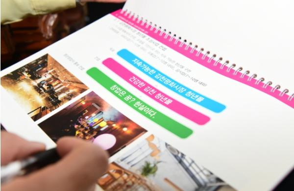 이날 보고회는 청년몰 조성사업 추진경과 보고, 김해용 사업단장의 사업 계획 보고 및 질의응답 순으로 진행되었으며, 지속가능한 김천 평화시장 청년몰 구현을 목표로 김천포도를 활용한 창업아이템 및 인테리어 등 컨셉에 관한 다양한 의견을 나눴다.