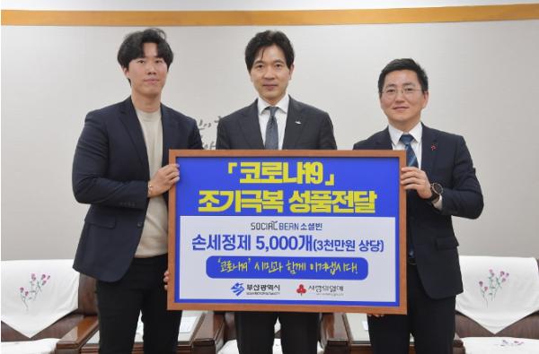 부산시(시장 오거돈)는 오늘(14일) 오후 3시, 시청 7층 접견실에서 전자상거래 창업기업 소셜빈(대표 김학수)과 기부물품(손 소독제 5,000개, 3천만 원 상당) 전달식을 개최했다고 밝혔다.