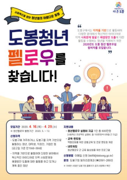 도봉구(구청장 이동진)가 공공문제 해결을 위해 사회혁신 활동을 수행중이거나 계획 중인 도봉구 청년들을 지원하기 위한 '청년펠로우' 참여자를 29일까지 모집한다.