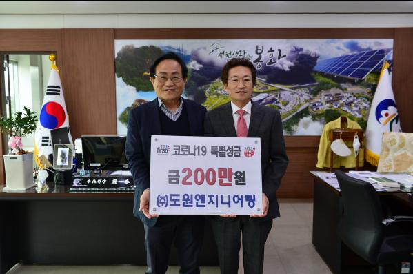 봉화군 ㈜도원엔지니어링(대표 김석현)에서 4월 10일(금) 봉화군청을 방문하여 코로나19 극복을 위한 특별성금 200만원을 기탁했다.