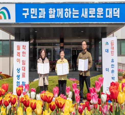 대전 대덕구(구청장 박정현)가 16일 구청에서 코로나19 영향으로 인한 소상공인 고통분담을 위해 송촌동과 석봉동에서 점포를 임대하고 있는 주민 유인순·박천영 씨와 착한 임대료 확산 릴레이 상생협약을 체결했다.