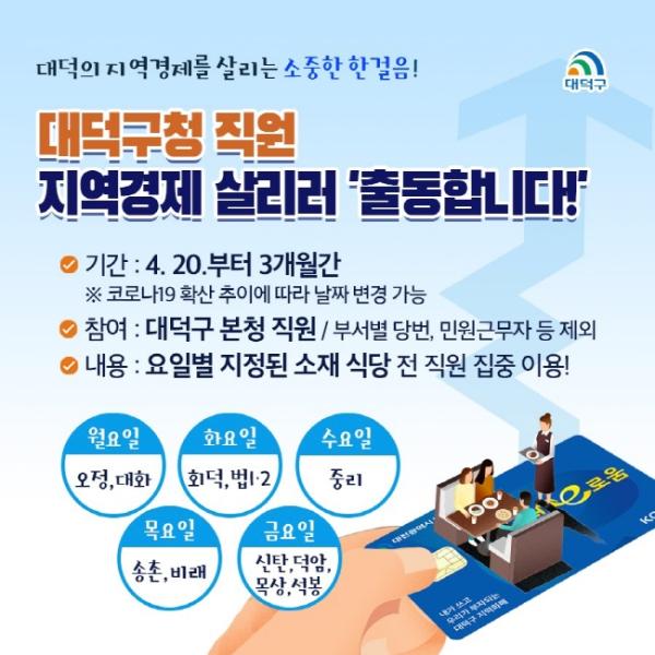 16일 구에 따르면 이러한 결정은 코로나19로 인해 평상시보다 음식점의 매출이 1/10로 감소하는 등 경제적 한파가 지속됨에도 좀처럼 소비가 살아나지 않자, 공무원들이 앞장 서 경제 활성화의 마중물 역할을 담당하자는데 의견이 모아져 시행하게 됐다. 공무원노조의 적극적인 협력과 직원들의 이해를 바탕으로 추진하게 됐으며 그 동안은 월 2회 직원식당 휴무일을 운영해 온 바 있다.